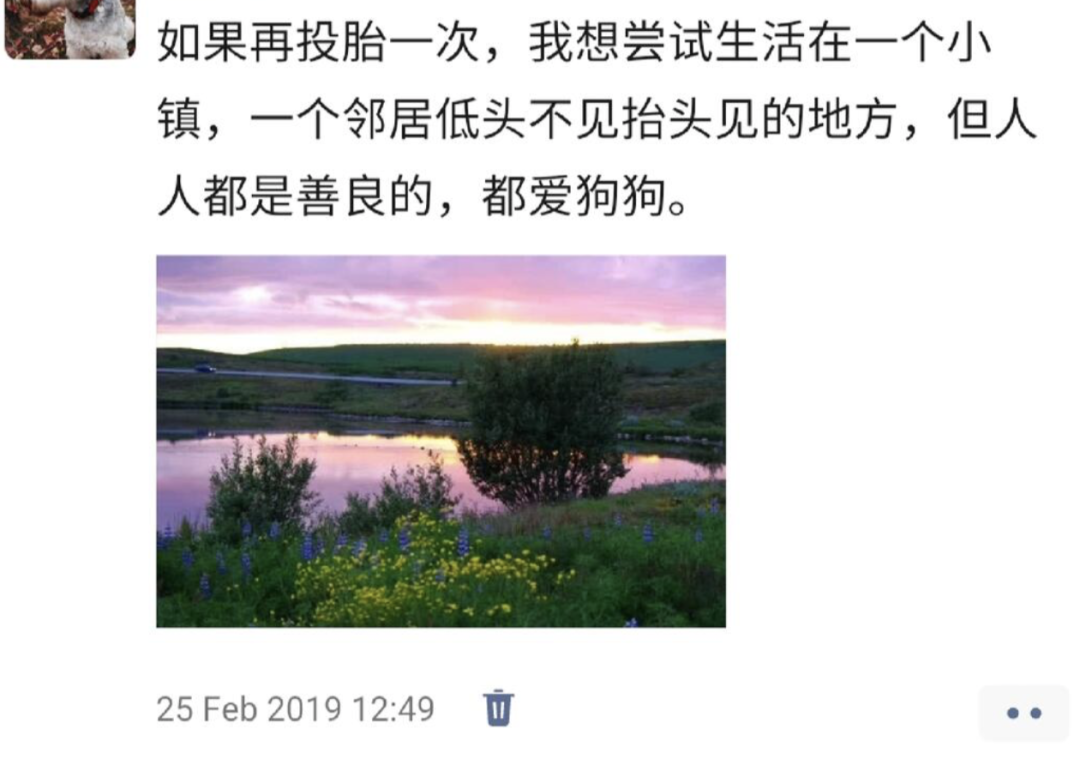 “如果再投胎一次,我想尝试生活在一个小镇,一个邻居低头不见抬头见的地方,但人人都是善良的,都爱狗狗。”